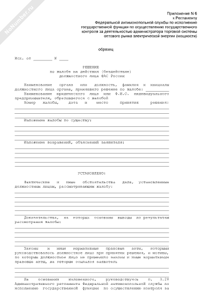 Решение по жалобе на действия (бездействие) должностного лица Федеральной антимонопольной службы России по исполнению государственной функции по осуществлению контроля за деятельностью администратора торговой системы оптового рынка электрической энергии (мощности) (рекомендуемый образец заполнения)