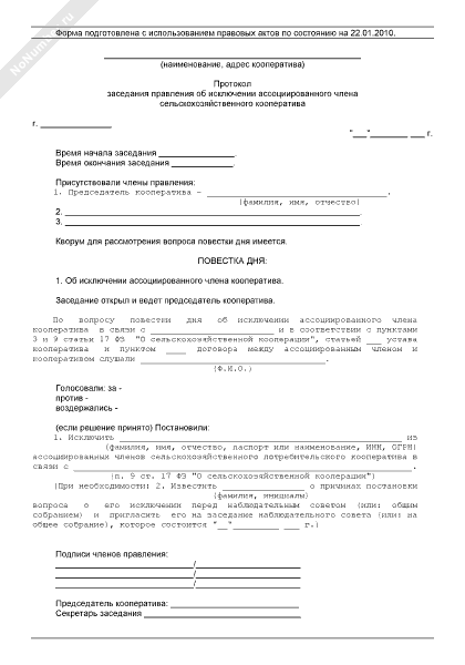 Решение (протокол заседания) правления сельскохозяйственного кооператива об исключении ассоциированного члена кооператива