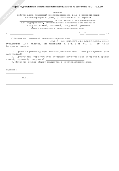 Решение собственника помещений многоквартирного дома о реконструкции многоквартирного дома (в том числе с его расширением или надстройкой), строительстве хозяйственных построек и других зданий, строений, сооружений, ремонте общего имущества в многоквартирном доме