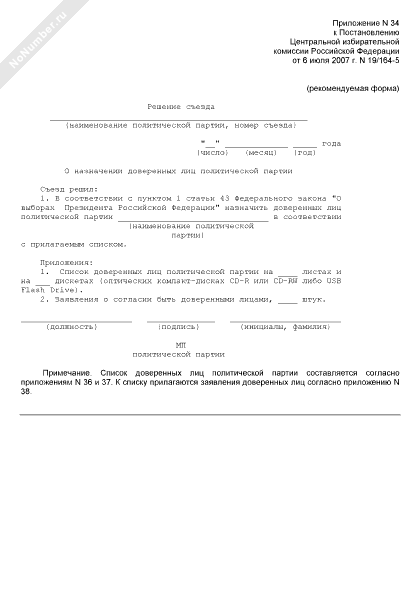 Решение съезда политической партии о назначении доверенных лиц политической партии (рекомендуемая форма)