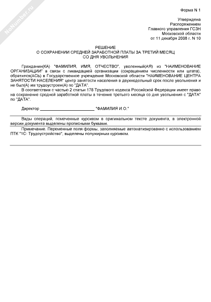 Решение Центра занятости населения Московской области о сохранении средней заработной платы за третий месяц со дня увольнения работника (форма № 1)