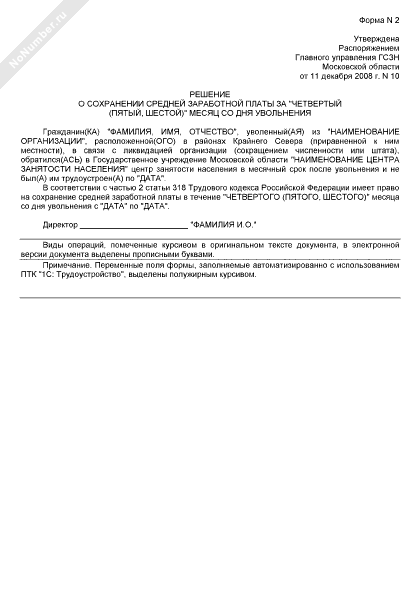 Решение Центра занятости населения Московской области о сохранении средней заработной платы за «четвертый (пятый, шестой)» месяц со дня увольнения работника, в связи с ликвидацией организации (сокращением численности или штата) в районах Крайнего Севера (форма № 2)