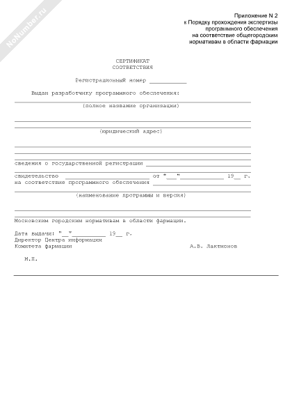 Сертификат соответствия программного обеспечения общегородским нормативам в области фармации (рекомендуемый образец заполнения)