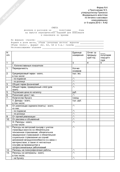 - 95Смета доходов и расходов на полугодие на выпуск периодических изданий для инвалидов и инвалидов по зрению (форма № 4)