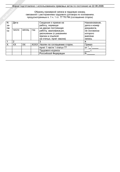 - 229Примерная формулировка записи в трудовую книжку, связанной с расторжением трудового договора по основаниям, предусмотренным п. 1 ч. 1 ст. 77 ТК РФ (соглашение сторон)