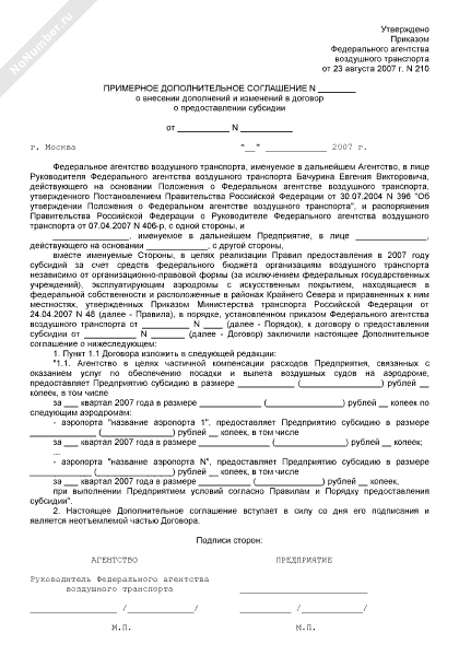- 232Примерное дополнительное соглашение о внесении дополнений и изменений в договор о предоставлении субсидии за счет средств федерального бюджета организациям воздушного транспорта независимо от организационно-правовой формы (за исключением федеральных государственных учреждений), эксплуатирующих аэродромы с искусственным покрытием, находящиеся в федеральной собственности и расположенные в районах Крайнего Севера и приравненных к ним местностях