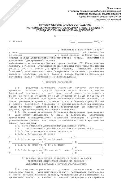 - 230Примерное генеральное соглашение на размещение временно свободных средств бюджета города Москвы на банковских депозитах