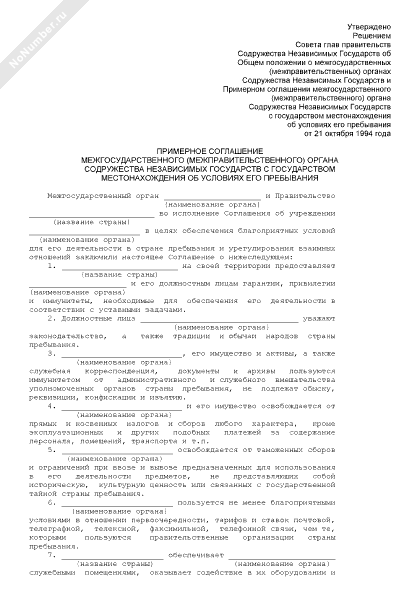 - 239Примерное соглашение межгосударственного (межправительственного) органа Содружества Независимых Государств с государством местонахождения об условиях его пребывания