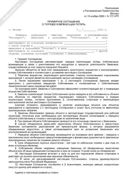 - 235Примерное соглашение о порядке компенсации потерь собственника, возникающих в связи с уничтожением его имущества в процессе деятельности заказчика при реконструкции и ликвидации энергообъектов, осуществляемой за счет средств городского бюджета