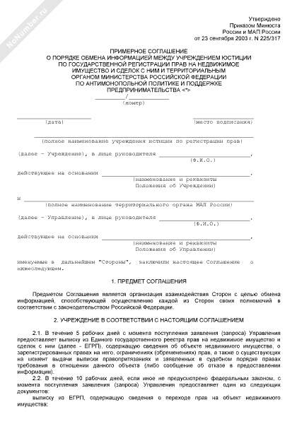 - 237Примерное соглашение о порядке обмена информацией между учреждением юстиции по государственной регистрации прав на недвижимое имущество и сделок с ним и территориальным органом Министерства Российской Федерации по антимонопольной политике и поддержке предпринимательства