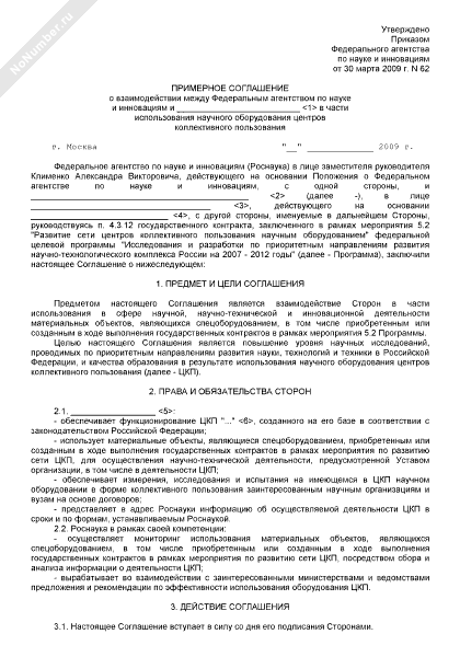 - 240Примерное соглашение о взаимодействии между Федеральным агентством по науке и инновациям и в части использования научного оборудования центров коллективного пользования