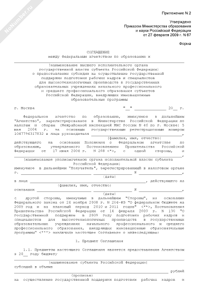- 284Соглашение между Федеральным агентством по образованию и высшим исполнительным органом государственной власти субъекта РФ о предоставлении субсидии на осуществление государственной поддержки подготовки рабочих кадров и специалистов для высокотехнологичных производств в государственных образовательных учреждениях начального профессионального и среднего профессионального образования субъектов Российской Федерации, внедряющих инновационные образовательные программы
