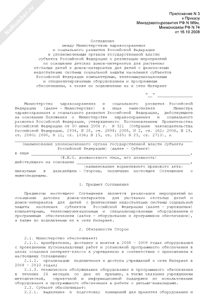 - 281Соглашение между Министерством здравоохранения и социального развития Российской Федерации и уполномоченным органом государственной власти субъекта Российской Федерации о реализации мероприятий по оснащению детских домов-интернатов для умственно отсталых детей и домов-интернатов для детей с физическими недостатками системы социальной защиты населения субъектов Российской Федерации компьютерным, телекоммуникационным и специализированным оборудованием и программным обеспечением, а также по подключению их к сети Интернет