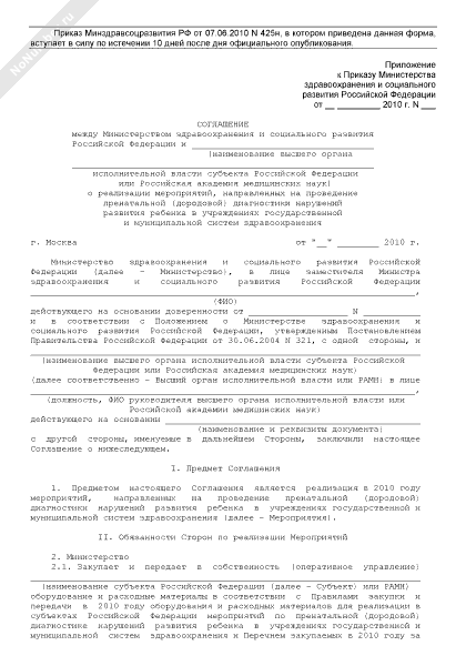 - 296Соглашение между Министерством здравоохранения и социального развития Российской Федерации и высшим органом исполнительной власти субъекта Российской Федерации или Российской академией медицинских наук о реализации мероприятий, направленных на проведение пренатальной (дородовой) диагностики нарушений развития ребенка в учреждениях государственной и муниципальной систем здравоохранения