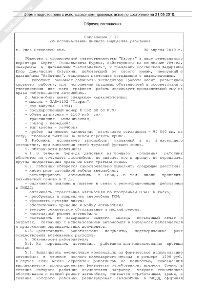 - 297Соглашение между работником и работодателем об использовании личного имущества работника (автомобиля)
