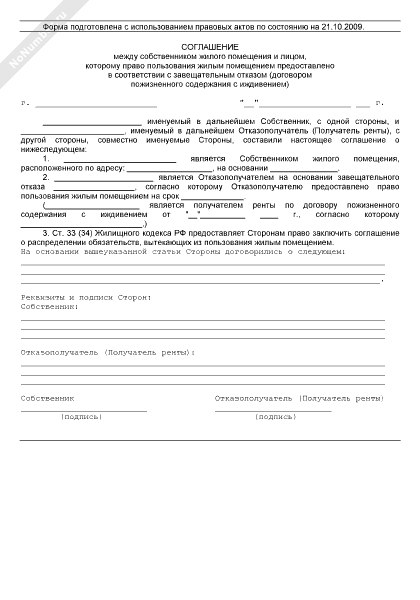 - 290Соглашение между собственником жилого помещения и лицом, которому право пользования жилым помещением предоставлено в соответствии с завещательным отказом (договором пожизненного содержания с иждивением)