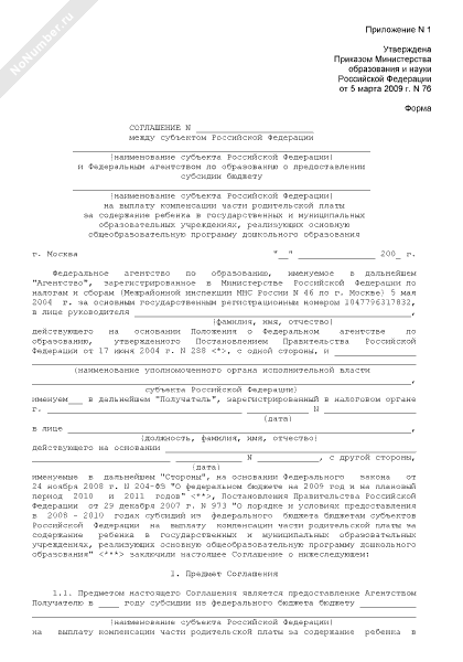 - 287Соглашение между субъектом Российской Федерации и Федеральным агентством по образованию о предоставлении субсидии бюджету субъекта Российской Федерации на выплату компенсации части родительской платы за содержание ребенка в государственных и муниципальных образовательных учреждениях, реализующих основную общеобразовательную программу дошкольного образования