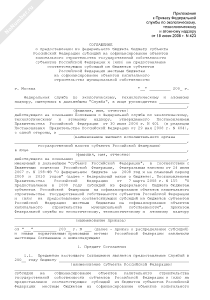 - 424Соглашение о предоставлении из федерального бюджета бюджету субъекта Российской Федерации субсидий на софинансирование объектов капитального строительства государственной собственности субъектов Российской Федерации и (или) на предоставление соответствующих субсидий из бюджетов субъектов Российской Федерации местным бюджетам на софинансирование объектов капитального строительства муниципальной собственности
