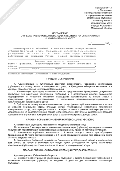 - 423Соглашение о предоставлении компенсации (субсидии) на оплату жилья и коммунальных услуг в г. Юбилейный Московской области