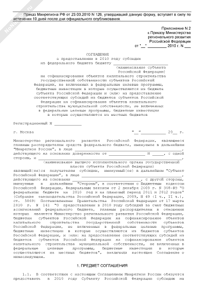 - 439Соглашение о предоставлении в 2010 году субсидии из федерального бюджета бюджету субъекта Российской Федерации на софинансирование объектов капитального строительства государственной собственности субъектов Российской Федерации, не включенных в федеральные целевые программы, бюджетные инвестиции в которые осуществляются из бюджета субъекта Российской Федерации и (или) на предоставление соответствующих субсидий из бюджетов субъектов Российской Федерации на софинансирование объектов капитального строительства муниципальной собственности