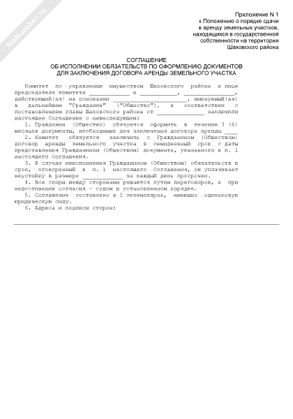 - 510Соглашение об исполнении обязательств по оформлению документов для заключения договора аренды земельного участка на территории Шаховского района Московской области