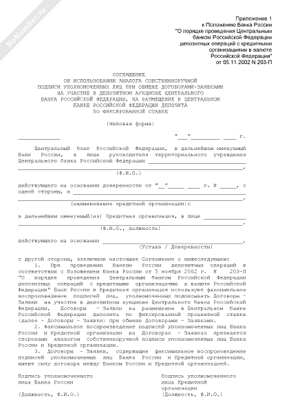 - 506Соглашение об использовании аналога собственноручной подписи уполномоченных лиц при обмене договорами-заявками на участие в депозитном аукционе Центрального банка Российской Федерации, на размещение в Центральном банке Российской Федерации депозита по фиксированной ставке
