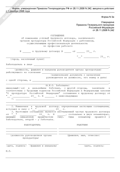 - 516Соглашение об изменении условий трудового договора, заключенного органом прокуратуры Российской Федерации с работником, осуществляющим профессиональную деятельность по профессии рабочего. Форма № 3а