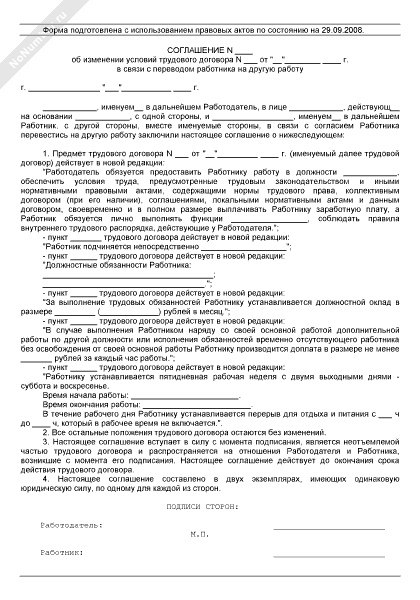 - 509Соглашение об изменении условий трудового договора в связи с переводом работника на другую работу