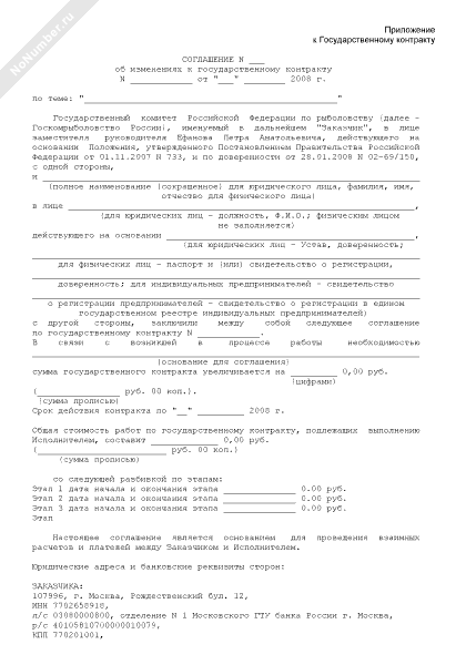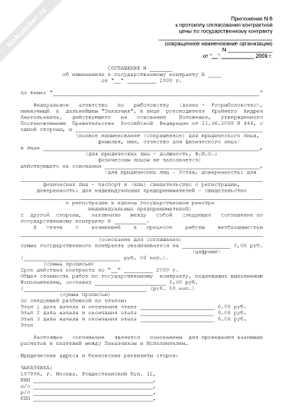 - 505Соглашение об изменениях к государственному контракту (приложение к протоколу согласования контрактной цены по государственному контракту на выполнение в 2009 году научно-исследовательских и опытно-конструкторских работ по направлению «Научное обеспечение мероприятий по разработке нормативов расходов на осуществление мероприятий по охране водных биоресурсов и среды их обитания, искусственному воспроизводству водных биоресурсов, акклиматизации и рыбохозяйственной мелиорации» для нужд Федерального агентства по рыболовству)