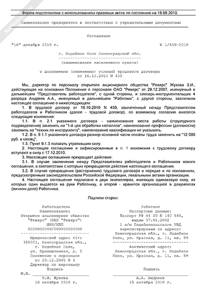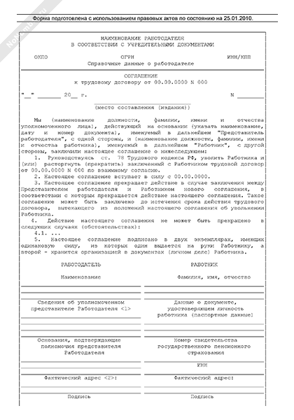 - 724Соглашение о дополнении (изменении) условий трудового договора с работником