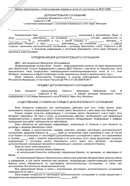 Дополнительное соглашение к договору банковского счета, открытого в коммерческом банке, о получении информации о состоянии банковского счета через Интернет (рекомендуемый образец заполнения)