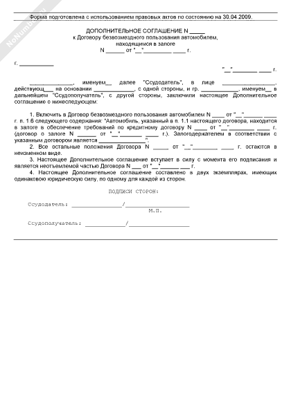 Дополнительное соглашение к договору безвозмездного пользования автомобилем, находящимся в залоге (рекомендуемый образец заполнения)