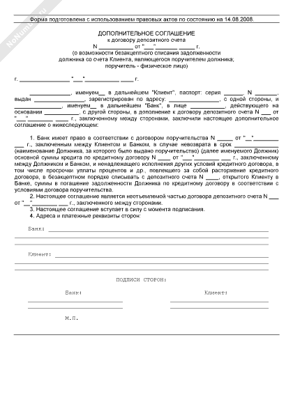 Дополнительное соглашение к договору депозитного счета (о возможности безакцептного списания задолженности должника со счета клиента, являющегося поручителем должника; поручитель — физическое лицо)