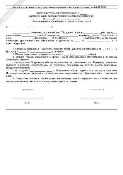 Дополнительное соглашение к договору купли-продажи товара (с условием о рассрочке) об определении общей цены и сроков оплаты товара