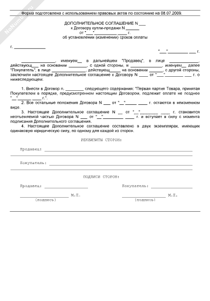 Дополнительное соглашение к договору купли-продажи об установлении (изменении) сроков оплаты