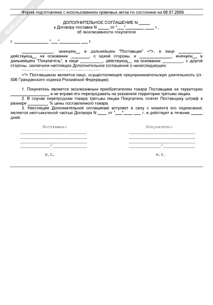 Дополнительное соглашение к договору поставки товара об эксклюзивности покупателя (рекомендуемый образец заполнения)