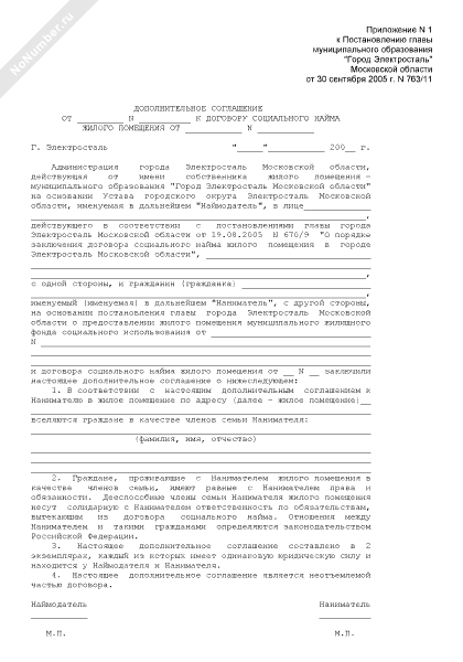Дополнительное соглашение к договору социального найма жилого помещения в г. Электросталь Московской области о вселении граждан в качестве членов семьи нанимателя (рекомендуемый образец заполнения)