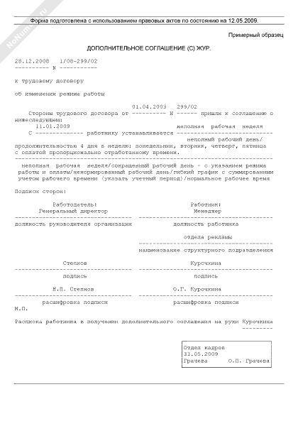 Дополнительное соглашение к трудовому договору об изменении режима работы (рекомендуемый образец заполнения)