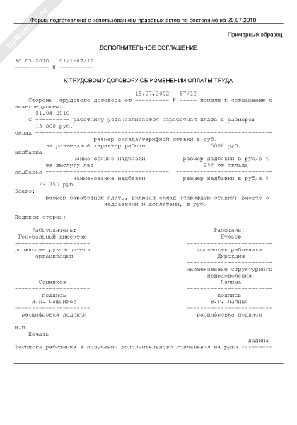 Дополнительное соглашение к трудовому договору об изменении оплаты труда (рекомендуемый образец заполнения)
