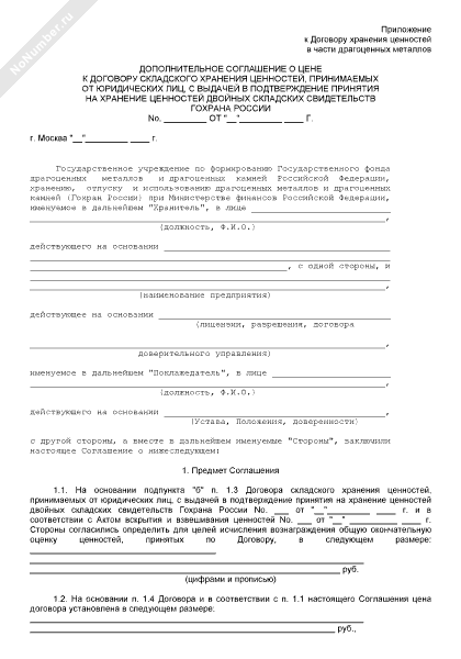 Дополнительное соглашение о цене (приложение к договору складского хранения ценностей, принимаемых от юридических лиц, с выдачей в подтверждение принятия на хранение ценностей двойных складских свидетельств Гохрана России)