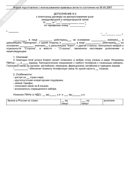 Дополнительное соглашение об оказании услуг (приложение к агентскому договору на распространение услуг международной и междугородной связи)