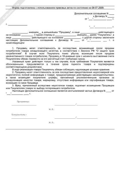 Дополнительное соглашение об ответственности продавца перед конечным потребителем в случае ненадлежащего качества товара (приложение к договору купли-продажи алкогольной продукции)