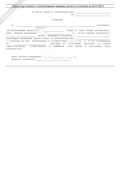 Согласие гражданина на назначение его помощником гражданину, который по состоянию здоровья не может самостоятельно осуществлять и защищать свои права и исполнять свои обязанности (рекомендуемый образец заполнения)
