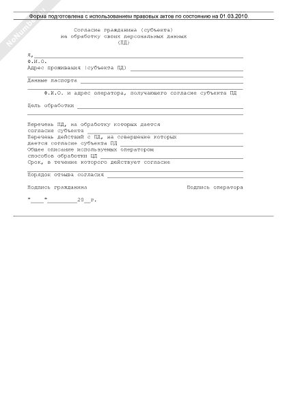 Согласие гражданина (субъекта) на обработку своих персональных данных