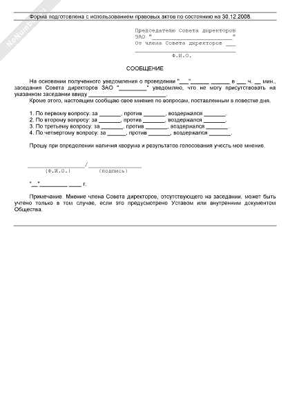 - 235Сообщение члена совета директоров о невозможности его присутствия на очередном заседании совета директоров