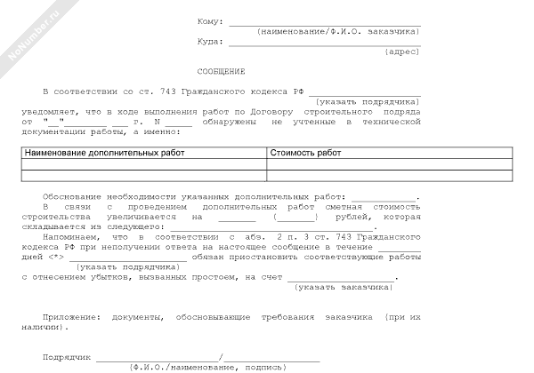 - 225Сообщение подрядчика заказчику об обнаружении в ходе строительства не учтенных в технической документации работ и необходимости проведения в связи с этим дополнительных работ и увеличения сметной стоимости строительства