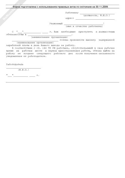 - 227Сообщение работодателя работнику о намерении погасить задолженность по заработной плате с требованием о выходе работника на работу