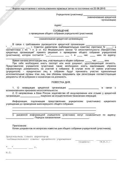 - 232Сообщение учредителям (участникам) кредитной организации о проведении общего собрания для рассмотрения вопроса о ликвидации кредитной организации в связи с возникновением признаков несостоятельности (банкротства) кредитной организации
