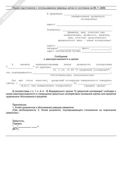 Сообщение лица в правление кооператива о своей заинтересованности в сделке (рекомендуемый образец заполнения)