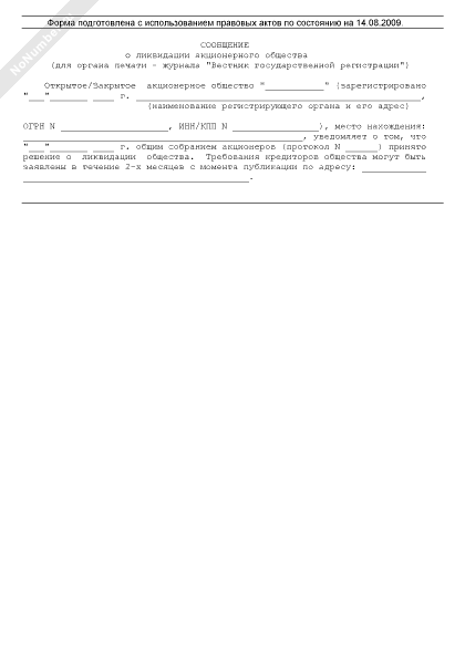 Сообщение о ликвидации акционерного общества (для органа печати — журнала «Вестник государственной регистрации»)